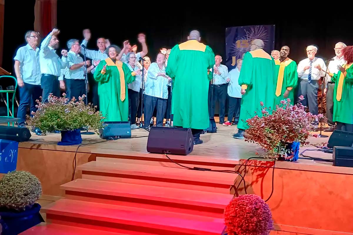Nach einer kurzen Pause, in der Getränke und Kanapees gereicht wurden, betrat Olivia O’Neal mit ihrem Chor die Bühne im Bürgerhaus und begeisterte das Publikum mit ihren Gospelsongs. Teilweise wurde sogar zum Mitsingen aufgefordert. Es war grandios. Besonders die Mitsingstücke „Down by the Riverside“, „Kumbaya“ und „Go Tell It on the Mountain“ wurden vom Publikum begeistert aufgenommen. Aber auch die weiteren Liedvorträge waren außerordentlich. Höhepunkt war der gemeinsame Auftritt der Aegidienberger Stimmen, des Gospelchores und Pamela O’Neal mit „Oh Happy Day“. Der Beifall wollte nicht enden, und es gab zahlreiche Zugaben. Bei „He’s Got the Whole World“ wirkte auch der Aegidienberger Chor erneut mit.