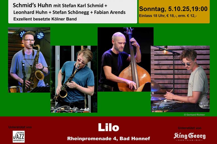 Bad Honnef – Die Konzertreihe Jazz im Lilo startet am Sonntag, den 5. Oktober 2025, in ihre neue Saison. Zum Auftakt spielt das renommierte Quartett Schmid’s Huhn mit Stefan Karl…