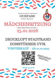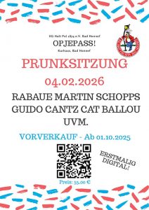 Was erwartet die Besucher? Traditionell lockt die Mädchensitzung am 25. Januar 2026 sowie die Prunksitzung am 4. Februar 2026 zahlreiche Jecken ins Kurhaus Bad Honnef. Auf der Bühne stehen wieder einige bekannte Größen aus dem Kölner Karneval, die für beste Stimmung sorgen werden. Unter anderem dabei sein werden die Domstürmer, Druckluft, Guido Cantz, Martin Schopps und Cat Balou. Die Sitzungen werden dabei zum zweiten Mal von Sitzungspräsident Carl Pütz geleitet, der im vergangenen Jahr erfolgreich sein Debüt gefeiert hat.