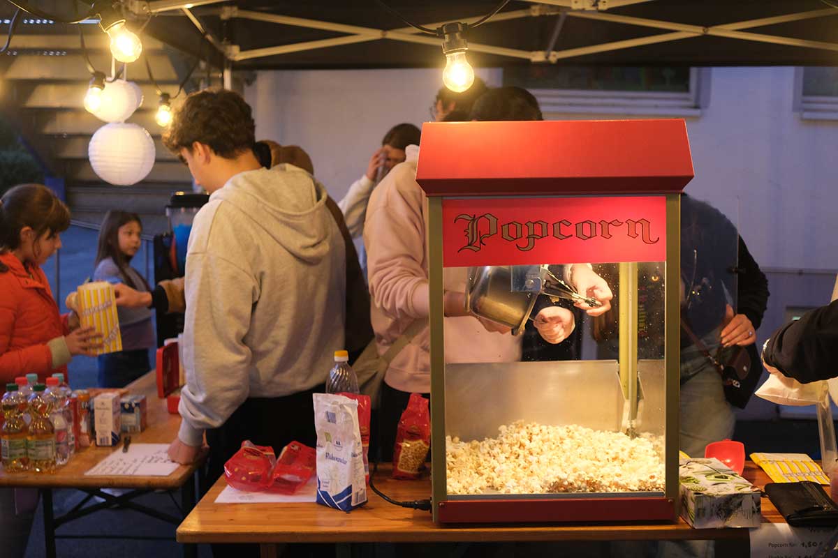 Schon ab früh füllte sich der wettergeschützte Schulhof mit Picknickdecken, Kissen und Campingstühlen. Für die gewohnte Verpflegung sorgte in diesem Jahr der Abijahrgang der Gesamtschule Sankt Josef. Mit süßen Snacks und Popcorn, sowie erfrischenden Getränken entstand rasch echtes Kino-Flair.